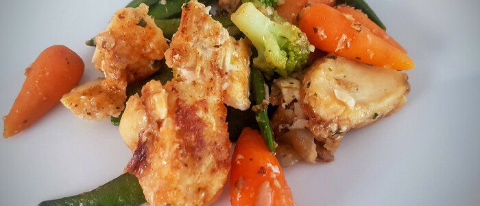 - Nyní je čas dát zeleninu bokem a nakrájíme si rybu na kousky. V misce smícháme hladkou mouku se vším sušeným kořením a trochou soli. Jednotlivé kousky ryby obalíme ze všech stran v mouce a položíme na pánev, kde jsme rozehřáli olej. Orestujeme ze všech stran a až v samotném závěru přidáme zeleninu. Chvilku restujeme vše dohromady a přibližně 3 minuty před koncem vlijeme lžíci rybí omáčky. Pořádně promícháme, prohřejeme a můžeme podávat. Kousky smažené ryby a křupavá zelenina určitě zachutná celé rodině.