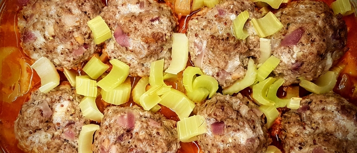 Můžeme ještě dochutit bylinkami dle vlastní chuti. Nahoru položíme připravené masové koule a vše před vrácením do trouby přikryjeme alobalem. Pečeme ještě zhruba půl hodiny a následně necháme péct ještě zhruba 10 minut odkryté, aby maso dostalo hezčí barvu.