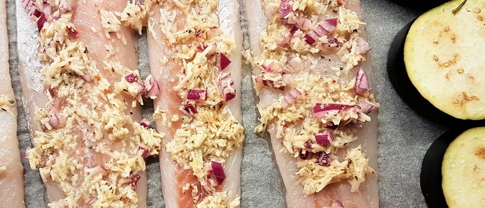 Osušené ryby položíme na plech vyložený pečícím papírem. Do misky zatím dáme nastrouhaný parmazán, rozmačkaný česnek a na drobno nakrájenou cibulku. Přidáme olej, šťávu z poloviny citronu a okořeníme. Vše promícháme a každý filet směsí potřeme. Pokud by byla směs příliš tuhá, klidně přidejte trochu vody, nic tím nezkazíte, při pečení se odpaří.