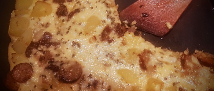 Mezitím si vejce rozmícháme se solí, pepřem, mlékem a čedarem. Nezapomeňte na majoránku s kterou rozhodně nešetřete. Jakmile je směs na pánvi připravená, přelijte směsí vajíček a mírně promíchejte. Nyní už je důležité omeletu vůbec nemíchat až do konce její přípravy. Vše nechte na plotně na mírném plameni, nebo celou pánev vložte do trouby. Jakmile vajíčka ztuhnou i uprostřed máme hotovo.