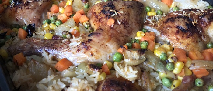 Kuře pečené s rýží v jednom pekáčku je skvělou alternativou základního jídla a díky tomu, že se rýže peče spolu s kuřetem, "nasákne" výbornou chuť.