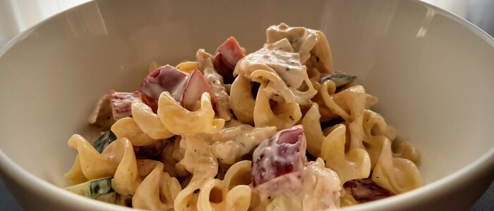 Jinak je samotná příprava velmi snadná. Těstoviny uvaříme "na zkus" a necháme vychladnout. V misce smícháme nakrájená rajčata, okurku, smetanu a sůl s bílým pepřem. Nakrájíme kuřecí prso, nebo ještě lépe natrháme. Trhané maso bude vypadat lépe a i se lépe jí.