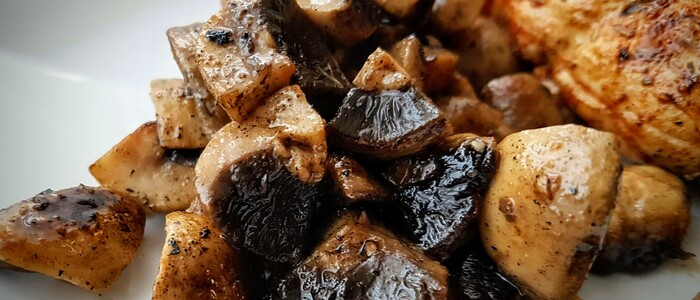 Žampiony si nejdříve očistěte, odstraňte nožičku a z kloboučku stáhněte slupku. Pak jednotlivé kloboučky nakrájejte podle libosti, buď na plátky, nebo na kousky.