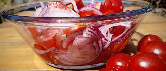 Rajčata se opláchneme, zbavíme "bubáka" a ostrým nožem rozpůlíme. Každou půlku pak nakrájíme na plátky a ty dáme do misky. Cibuli nakrájíme na tenké plátky, rozdělíme jednotlivá kolečka a přidáme k račatům.
