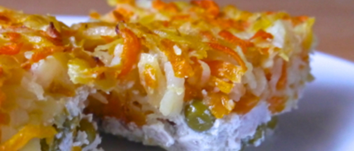 Kuřecí prsa nakrájejte na malé kousky. Smíchejte s hráškem a zakysanou smetanou, dochuťte špetkou soli a pepře a dejte do zapékací mísy.