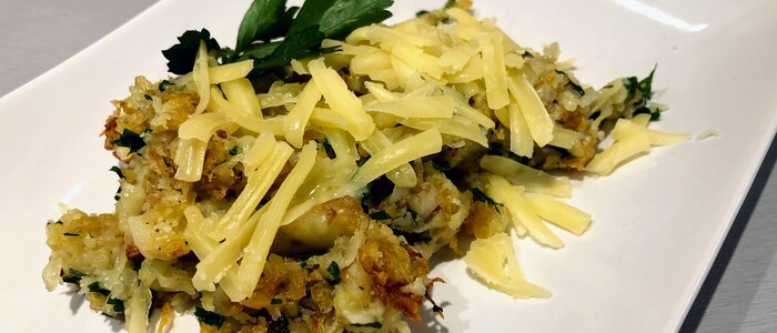 Recept je snadný a vlastně jde o variaci na klasickou večeři našich babiček. Právě proto můžeme podávat ideálně s tvarohem. Nebo vyzkoušejte jen posypat sýrem.