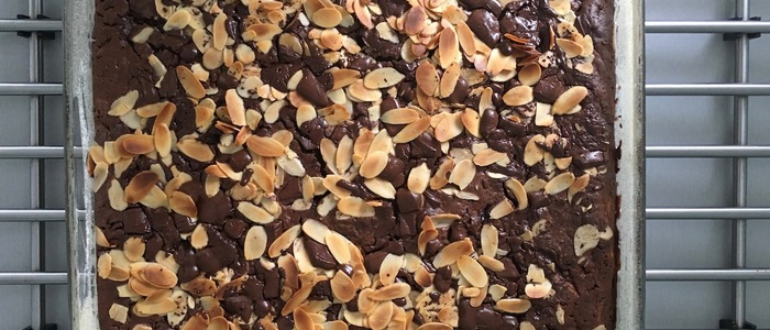 Vychlazenou čokoládovou buchtu s mandlemi nakrájíme a pak už jen vychutnáváme.