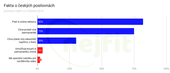 Výše jsme zmínili, že 82% českých posiloven investuje do online reklam a celých 75% se snaží získat víc nových zákazníků, kteří si u nich koupí členství nebo permanentku. K tomu 30% posiloven uvedlo, že chce získat více zákazníků přímo z firem.