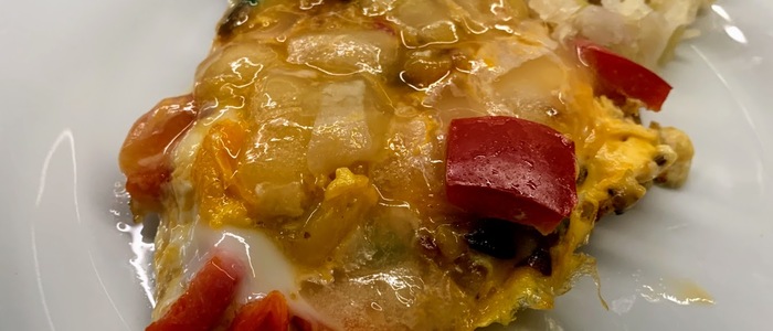 Nyní už jen stačí vše ostatní, mimo syrečků, smíchat a opečené brambory směsí přelít. Omeletu nemícháme, maximálně postupně necháme stéct tekuté vejce ke kraji. Celý trik je v nízké teplotě pánve. Omeleta si zkrátka žádá svůj čas.