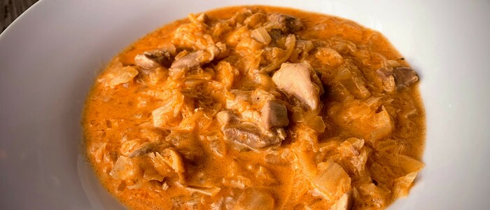 Z kuřete je lepší použít stehna, než prsa. I když jsou libovější, toto jídlo si přece jen trochu tuku vyžaduje. Stehna jsou křehčí a spolu s kysaným zelím chutnají skvěle.
