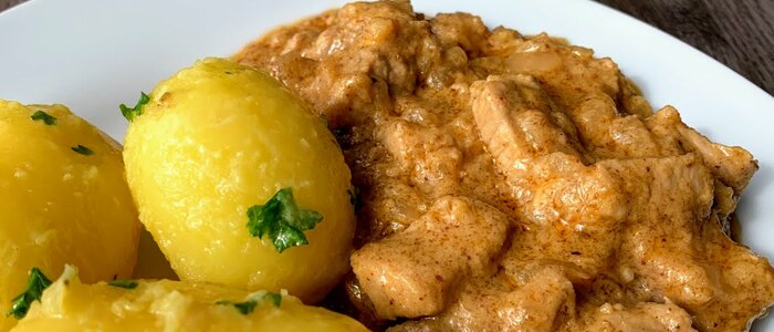 Nyní už stačí jen maso dát na pánev s cibulkou, osolit, opepřit a přidat papriku spolu s hořčicí. Vše spolu hezky promícháme a necháme podusit do změknutí. Bude-li třeba, přidejte trochu vody. Ale vepřové maso by mělo pustit šťávy dost. Pokud je tekutiny naopak moc, necháme ji zredukovat bez pokličky, za stálého míchání.