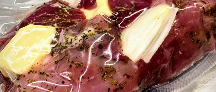 Jednotlivé porce tedy máme nachystané a ty pouze osolíme, opepříme, přidáme nasekaná rozmarýn, ale klidně použijte i jiné koření. Jen to nepřežeňte, maximálně by maso mělo být ochuceno dvěma druhy bylinek, chceme si totiž vychutnat jeho chuť. Přidáme kousek másla, šalotku a za vakuujeme.