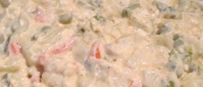 Uvařené brambory necháme vychladnout, oloupeme a nakrájíme na kostičky. Stejně tak uvařenou zeleninu necháme vychladnout a společně se sterilovanými okurkami nakrájíme na kostičky. Smícháme dohromady a přidáme sterilovaný hrášek. Na závěr už jen dochutíme solí, případně pepřem a podle chuti přidáme jogurt a hořčici.