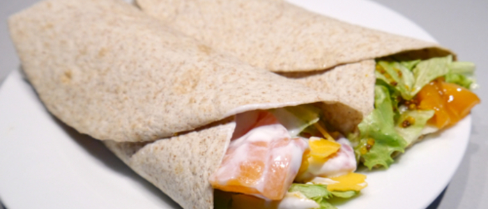 Na tortilu pak doprostřed od spodní cca 1/4 položíme salát a na něj pak lososa obaleného v jogurtové omáčce. Přidáme kousky čedaru a tortilu zabalíme nejprve z jedné, pak z druhé strany. Další trotilu pak použijeme pro medovo hořčičnou omáčku s lososem (bez čedaru).