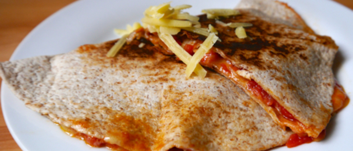 Pak už jen na teplou quesadilu stačí nastrouhat trochu čedaru a můžeme se do ní pustit.