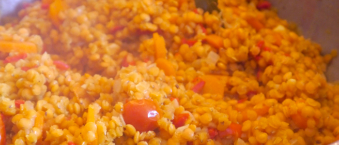 V hlubší pánvičce rozpálíme olej a orestujeme cibulku. Jakmile zesklovatí, přidáme ostatní zeleninu a chvíli restujeme. Nakonec přisypeme do pánvičky červenou čočku a zalijeme vodou - množství by mělo být takové, aby byla čočka se zeleninou těsně ponořená. Vše pořádně promícháme, dokořeníme solí a pepřem, kari a za občasného míchání vaříme, než se vypaří voda (cca 15 minut). Čočku ochutnáme a pokud je ještě tvrdá, vodu podle potřeby dolijeme a necháme znovu vyvařit.
