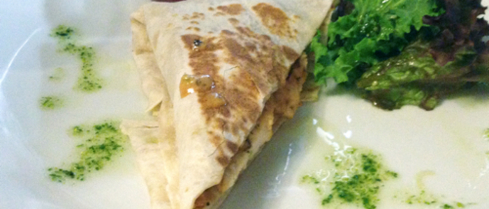 Tortilu si necháme změknout třeba v mikrovlnné troubě na nízký stupeň výkonu a mírně potřeme vodou. Naplníme ji směsí a zabalíme do úhledného balíčku, který nakonec orestujeme z obou stran na suché pánvičce.