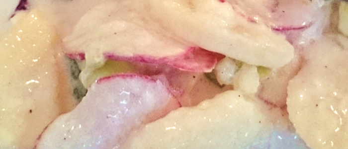 Brambory a necháme uvařit v osolené vodě. Mezitím očistíme ředkvičky i cibulku a obojí nakrájíme na tenké plátky/kolečka.