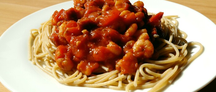 Sušená rajčata vyjmeme z oleje a nakrájíme na malé kousky. Trochu olejeme použijeme na pánev a osmažíme na něm na kousky nakrájenou cibuli. Jakmile máme cibulku zpěněnou, přisypeme rajčata a orestujeme. Nakonec přidáme krevety a loupaná rajčata z konzervy. Osolíme, opepříme a přidáme špetku oregana. Provaříme, případn přidáme trošku cukru, pokud rajčata nebyla dostatečně zralá a sladká.