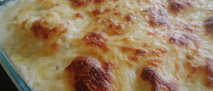 Květák očistíme a rozdělíme na menší růžičky. Dáme do vody, přivedeme k varu a vaříme cca jen 3-4 minuty, aby lehce změkl. Poté slijeme vodu a květák uložíme do zapékací mísy.