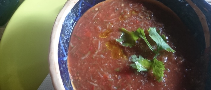 I když, podle ingrediencí, jde spíše o letní polévku, není důvod si ji nepřipravit i teď v zimě. postup je snadný a zvládne je i dítě. Rajčata oloupeme, což uděláme tak, že je na vrcholu nařízneme do kříže a ponoříme na chvilku do horké vody. Jakmile se začne slupka ovolňovat, vytáhneme rajčata a zchladíme studenou vodou, Pak už půjde slupka dolů skoro sama.