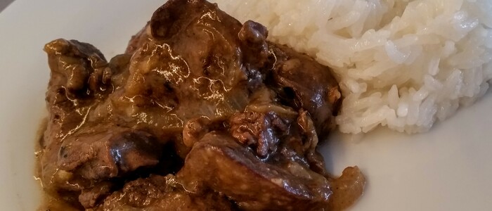 Kuřecí játra očistíme a omejeme. Osušíme a můžeme je rovnou dát na rozpálený olej, kde jsme předtím dali smažit cibulku, mírně orestujeme a přiklopíme pokličkou. Dusíme přibližně 10 minut, až jsou játra měkká a skutečně nim nepřidáváme žádné koření ani sůl. To vše přijde až jsou játra hotová. Játra odklopíme a poprášíme hladkou moukou, promícháme a necháme provařit. Omáčku dochutíme solí, pepřem a majoránkou. Podávat mžeme s rýží, nebo s chlebem.