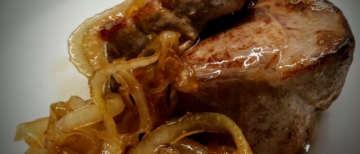 Na volné panvi nyní můžeme rozpustit máslo a na kolečka nakrájenou cibuli. Orestujeme poměrně delší dobu, klidně 5 minut, tak aby všechny kousky byly měkké. Jakmile takové jsou, zasypeme ji hnědým cukrem, přibližně velká polévková lžíce, ale opět záleží na velikosti cibule. Mícháme, až se vytvoří karamel a začne mírně hnědnout.
