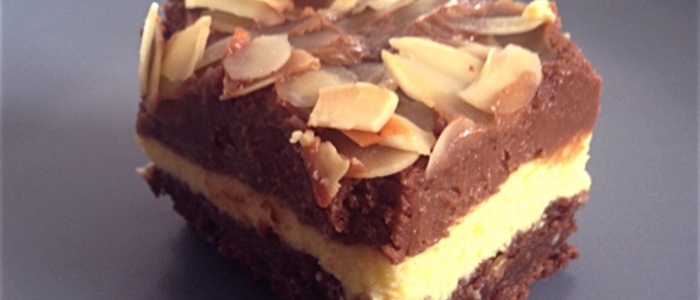 Jakmile korpus vychladne, nalijeme na něj nejdříve směs na cheesecake bez nutelly a opatrně zarovnáme. Navrch pak přidáme směs s nutellou a opět zarovnáme. Posypeme plátky mandlí a dáme péct do trouby předehřáté na 170 stupňů. Pečeme přibližně 35-45 minut, dokud mandle nezačnou na okrajích zlátnout.