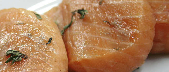 Porce lososa očistíme a doáme do pánve. Zalejeme vodou, ve které jme rozmíchali trochu citronové šťávy, sůl a pepř. Losos by měl být celý ponořený, ale není třeba to přehánět, tekutiny nemusí být moc. Vodu s lososem zahříváme a necháme mírně odpařovat, neměla by se vařit. Po zhruba čtvrt hodince je maso svetlé a pevné, to je doba, kdy můžeme nandávat.