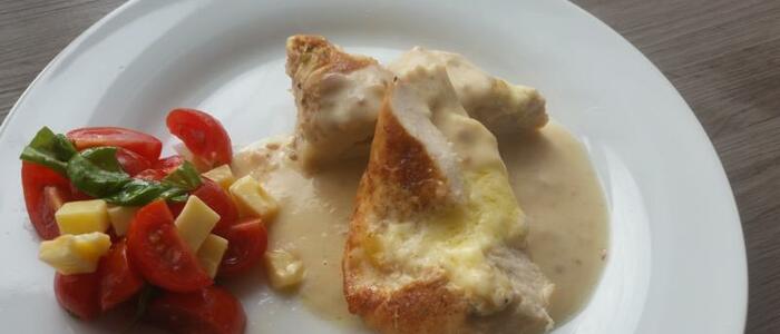 A teď už na samotnou přípravu. Kuřecí prsa položíme a tenkým nožem v nich uděláme kapsu, do té vložíme na kousky nakrájený sýr. Na pánvičce pak jednotlivé kousky ryhle orestujeme. Pak stačí jen položit prsa do pekáčku, ideálně dírou se sýrem nahoru. Posolíme, opepříme a nahrou přidáme kousky másla. Vlžíme do trouby a pečeme přibližně 25min na 180°C. Nakonec položíme ještě pplátky sýra a necháme rozpustit.