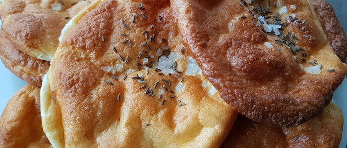 Vejce si rozdělíme na žloutky a bílky. Zatímco z bílků vyšleháme pevný sníh. Do žloutků dáme sůl, pepř, kypřící prášek tvaroh a vše spolu hezky promícháme. Troubu si předehřejeme na 150°C a mezitím smícháme směs tvarohu a sněhu. Vše míchejte po částech, aby sníh udržel hezky kyprou konzistenci. Nyní už jen stačí vyložit plech pečícím papírem a lžící udělat hromádky, které dozdobíme podle chuti. Například kmínem a hrubozrnnou solí. Pečeme přibližně 30 minut a máme hotovo.