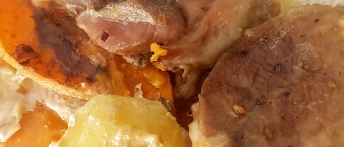 Brambory a batáty si oloupeme a nakrájíme na tenké plátky. Do pekáčku postupně klademe vrstvu brambor a proložíme batáty. Každou vrstvu osolíme a okořeníme. Nahoru už stačí jen položit plátky masa a zalít mlékem se smetanou. Vložíme do trouby a necháme péct, při 180°C přibližně 45 minut - až jsou brambory měkké a mléko se skoro vsáklo.
