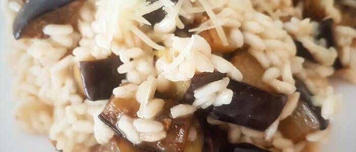 Lilek si nakrájím na větší kostky, cca 1 cm, ale měřit je skutečně nemusíte. Na pánvi rozehřejme malé množství oleje a vsypeme nakrájený lilek. Orestujeme, až dostane hezkou zlatavou barvu a těsně před sejmutím z ohně přidáme nasekaný česnek. Dávejte pozor, ať se česnek nepřipálí a nezhořkne. Lilek vysypeme do misky a stejnou pánev očistíme papírovým ubrouskem. Když je čistá, nasypeme na ni hrnek rýže a při občasném míchání ji orestujeme. Teď už jen stačí přidávat vždy malé množství vývaru, vždy tak, aby byly zrnka rýže ponořená. Promícháváme a čekáme, až se tekutina vsákne. Vývar přidáváme tak dlouho, dokud rýže nedosáhne požadované tvrdosti. Zrnka by měla být tak zvaně "na zkus", tedy mírně tvrdá. Závěrem už jen vmícháme lžíci másla - to způsobí krémovitost rizota a nastrouhaný parmezán. Vrátíme lilek, prohřejeme a můžeme podávat.