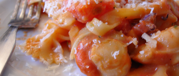 Hotovou směsí přelejeme těstoviny, které jsme připravili podle návodu na obalu. Zastrouháme parmazánem a můžeme servírovat.